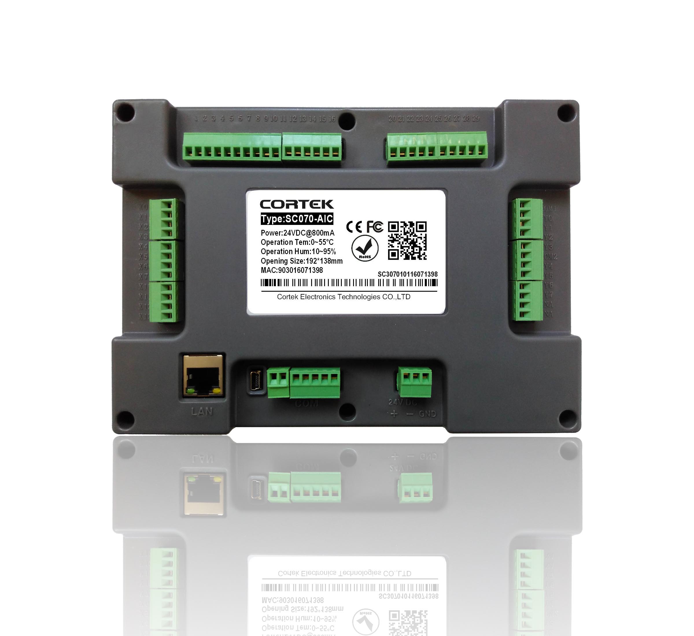 SC070-AIC 我公司發(fā)揮技術(shù)優(yōu)勢,為特定行業(yè)客戶開發(fā)的一款性價比非常高的專屬產(chǎn)品。產(chǎn)品將工業(yè)觸摸屏和PLC兩部分功能完美結(jié)合,組態(tài)采用我公司自行研發(fā)的組態(tài)軟件CORWARE V2.9.8,控制器邏輯采用常用的梯形圖方式編寫,兼容三菱FX1N。